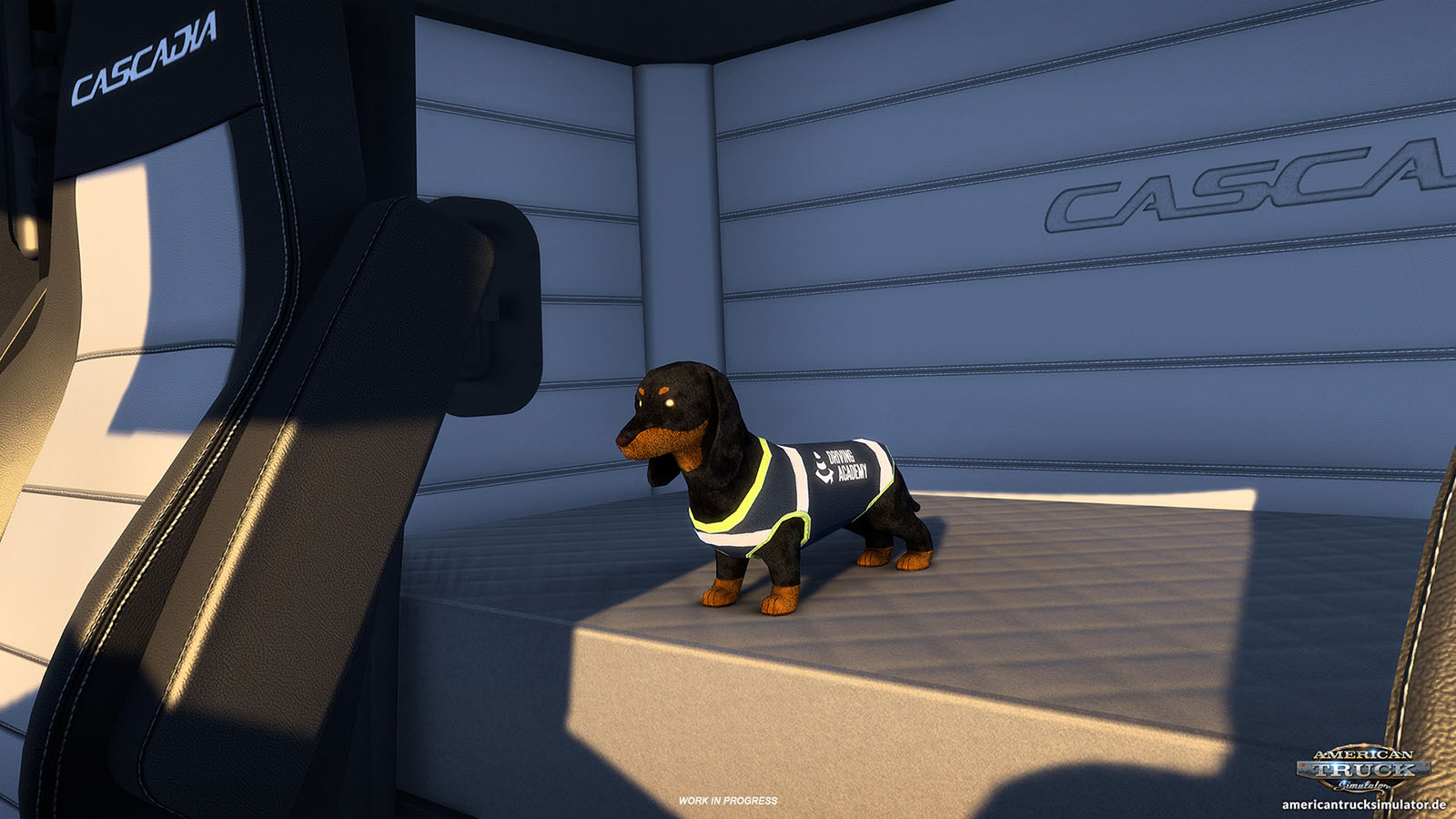 Absolvierst Du alle Szenarien des neuen Moduls erfolgreich, wirst Du sicherer im Umgang mit zwei Anhängern und bekommst symbolisch dafür auch eine Anerkennung für Deine Kabine in Form des Dackel-Spielzeugs Frankie, der Dich fortan auf Deinen Fahrten begleitet. Ab 12 gemeisterten Szenarien gibt es außerdem auch noch ein Steam-Achievement.