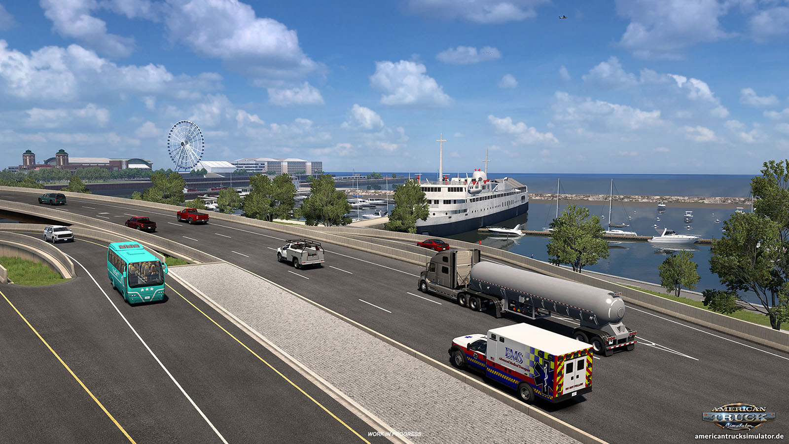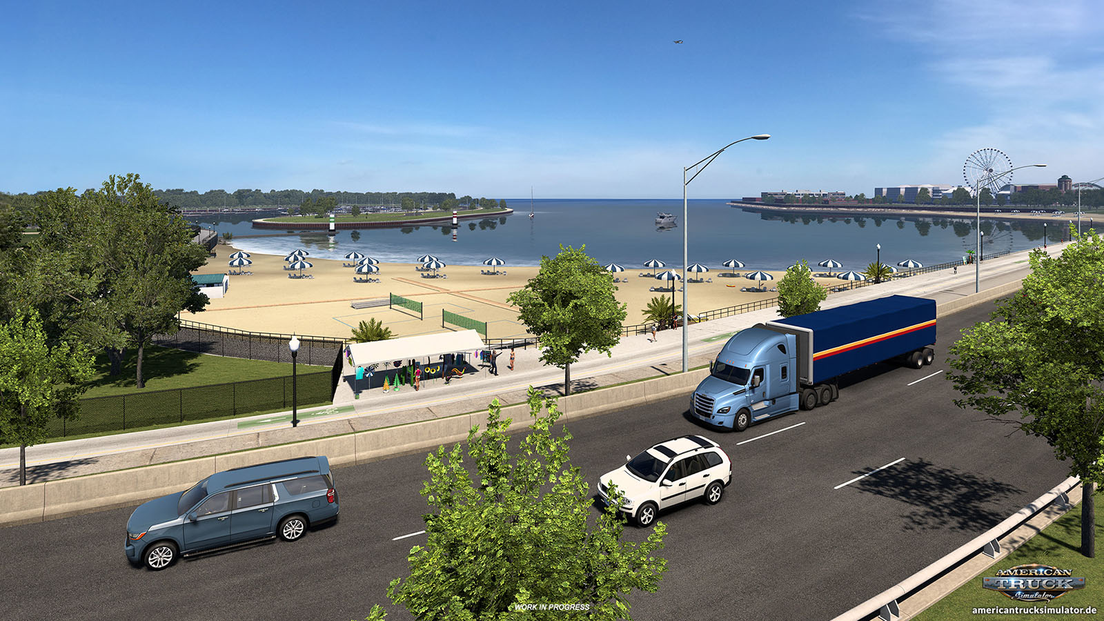 Wenn Du bald im American Truck Simulator durch Illinois rollst, fällt Dir schnell auf, wie vielfältig die Wasserlandschaften im „Prairie State“ sind – von urbaner Seenlandschaft bis zu naturbelassenen Sümpfen und Flusslandschaften. Im Norden des DLC-Gebiets prägt mit dem Lake Michigan einer der fünf großen Seen Nordamerikas das Bild rund um Chicago, wo Straßen am breiten Ufer entlangführen. Die Skyline der Stadt trifft dort auf weitläufiges Wasser, und an Orten wie am Oak Street Beach kannst Du die klassische Kombination aus Stadtpanorama und Seeuferkulisse erleben. Zusätzlich sind Abschnitte des Lakefront Park und des Lakefront Trail nachgebildet, die den gewissen Charme der Uferzone widerspiegeln.